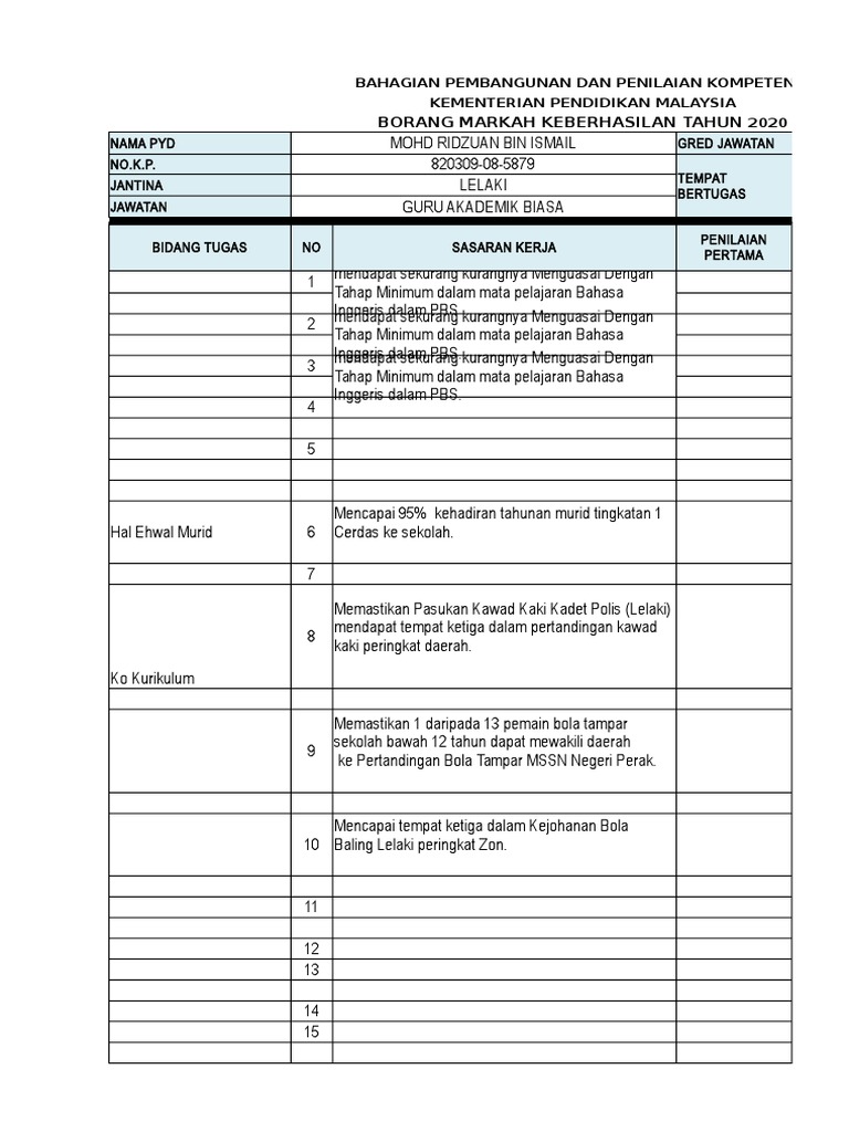 Borang keberhasilan ini disediakan di awal tahun dan dinilai pada pertengahan tahun. Tempat jantina lelaki smk dato' undang haji adnan bertugas jawatan gpk. Markah penilaian hendaklah diberi pada pertengahan tahun dan dimuktamadkan pada akhir tahun dalam tahun penilaian. Contoh penulisan sasaran keberhasilan 1. Borang markah keberhasilan tahun 2019 nama pyd mohammad bin said gred jawatan dg 52 no.k.p.