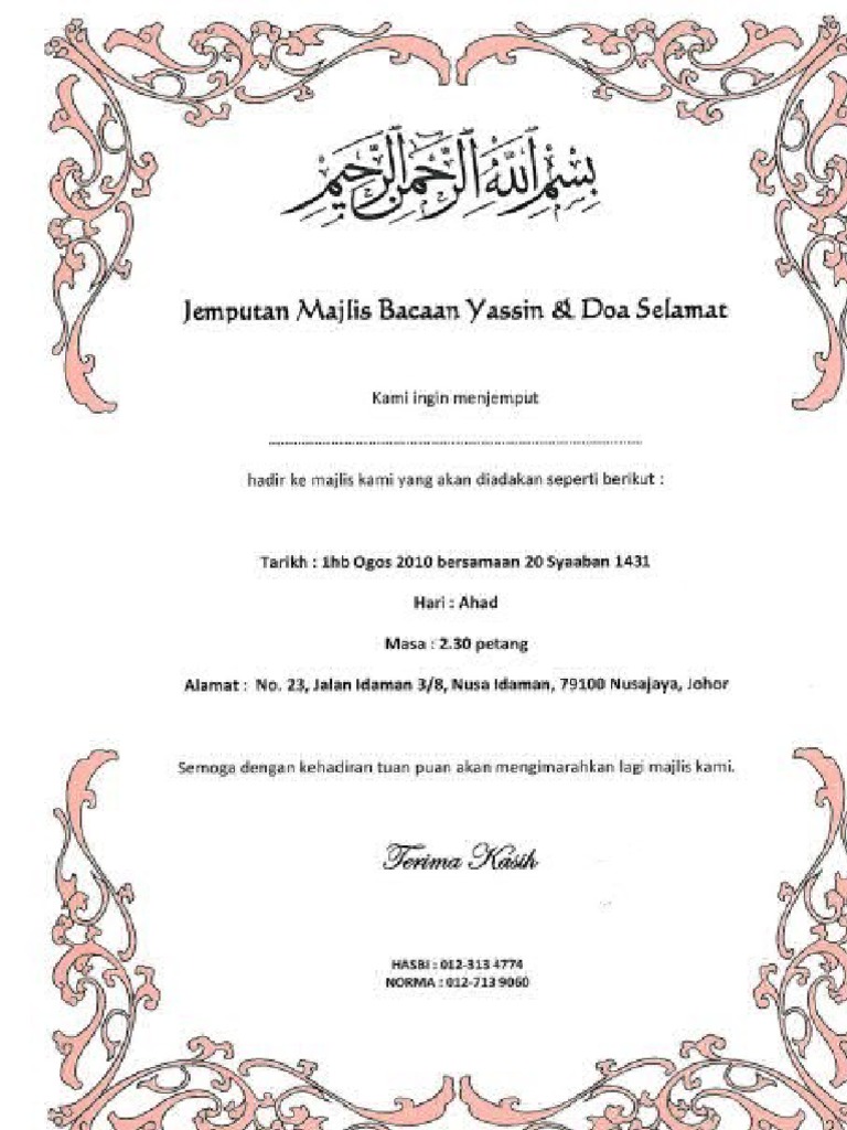 Kad jemputan digital anda akan kelihatan luar biasa di semua jenis peranti dan skrin. Jemputan majlis aqiqah tahlil dan doa selamat. Keselamatan di dunia sangat mahal harganya. Berikut merupakan kumpulan doa selamat yang lengkap mulai dari doa selamat di dunia dan di akhirat doa selamat bagi orang yang menggal dll. Dan sehingga mereka selalu memohon agar diberikan keselamatan. Moshims kad jemputan majlis tahlil jemputan tahlil dan doa arwah doa arawah contoh kad jemputan majlis tahlil arwah pengertian tahlil ialah secara harfiah yang berarti berdzikir dengan mengucap kata tauhid yakni kalimat la ilaha illallah dalam artinya tiada patut. Membuat kad menggunakan microsoft publisher infotech computer centre. Moshims kad jemputan kenduri doa selamat. Ya tuhan kami, berilah kami kebaikan hidup di dunia dan kebaikan hidup di akhirat, dan lindungilah kami dari azab neraka. Doa selamat dunia dan akhirat latinnya dan artinya lengkap, dari yang pendak sampai yang panjang, dan dalilnya juga keterangan ulama akan maknanya. Contoh kad jemputan majlis greeting card template projects to try card template. Contoh kad jemputan hari sukanfull description. Doa tahlil doa arwah doa selamat.